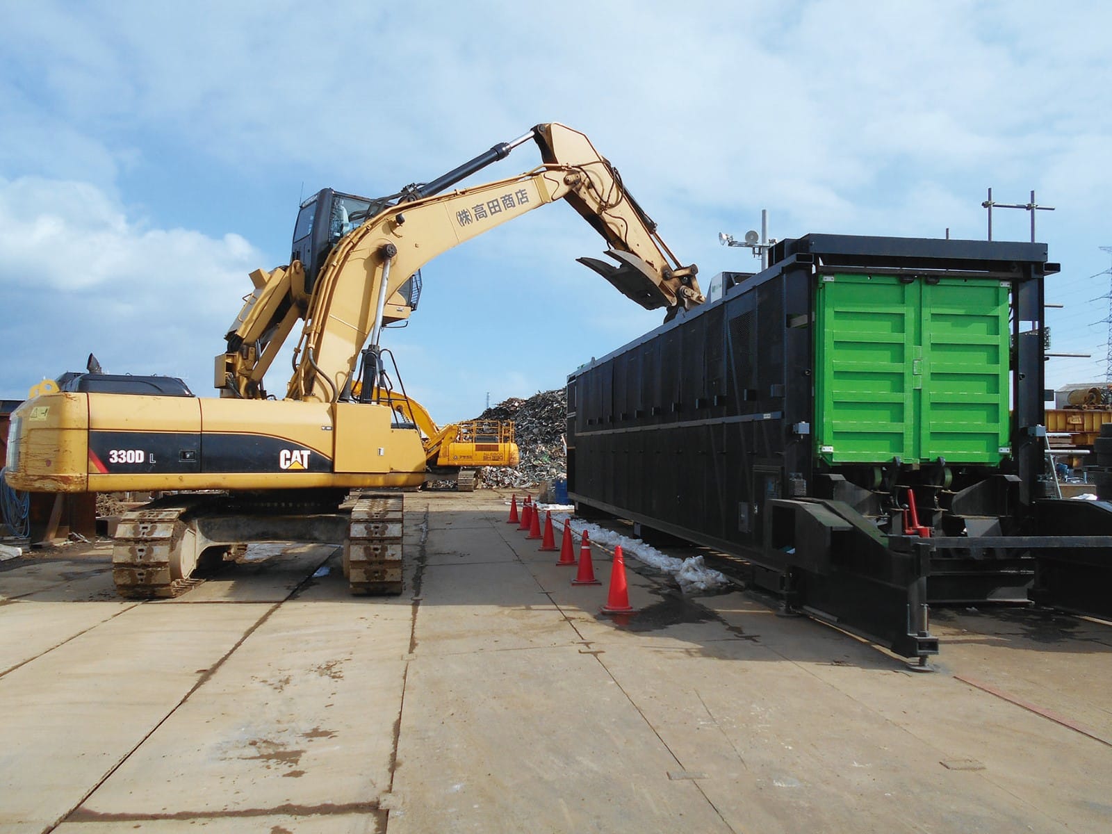 当社では、より広範な流通と販路の拡大を目指し、多賀城ヤードにFASTeK(スクラップコンテナ自動装機)を導入しました。これにより、効率的かつ経済的な流通を実現しています。